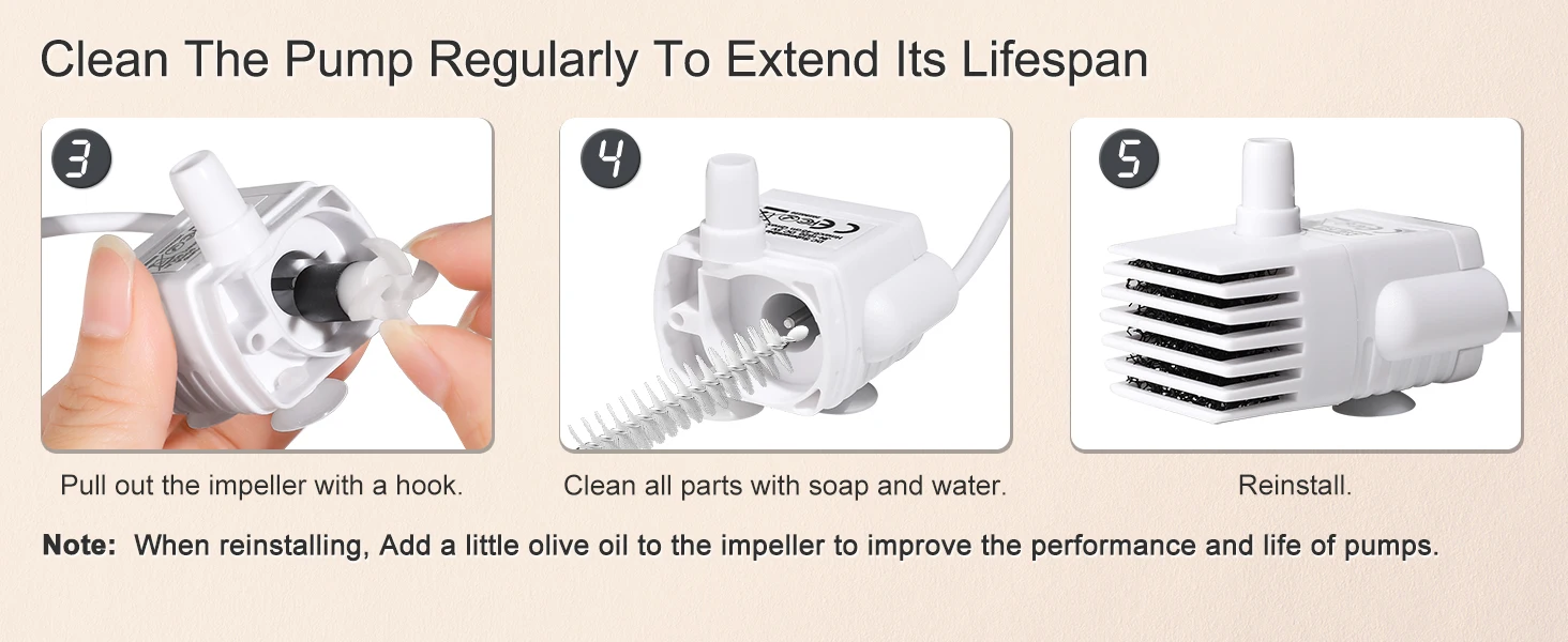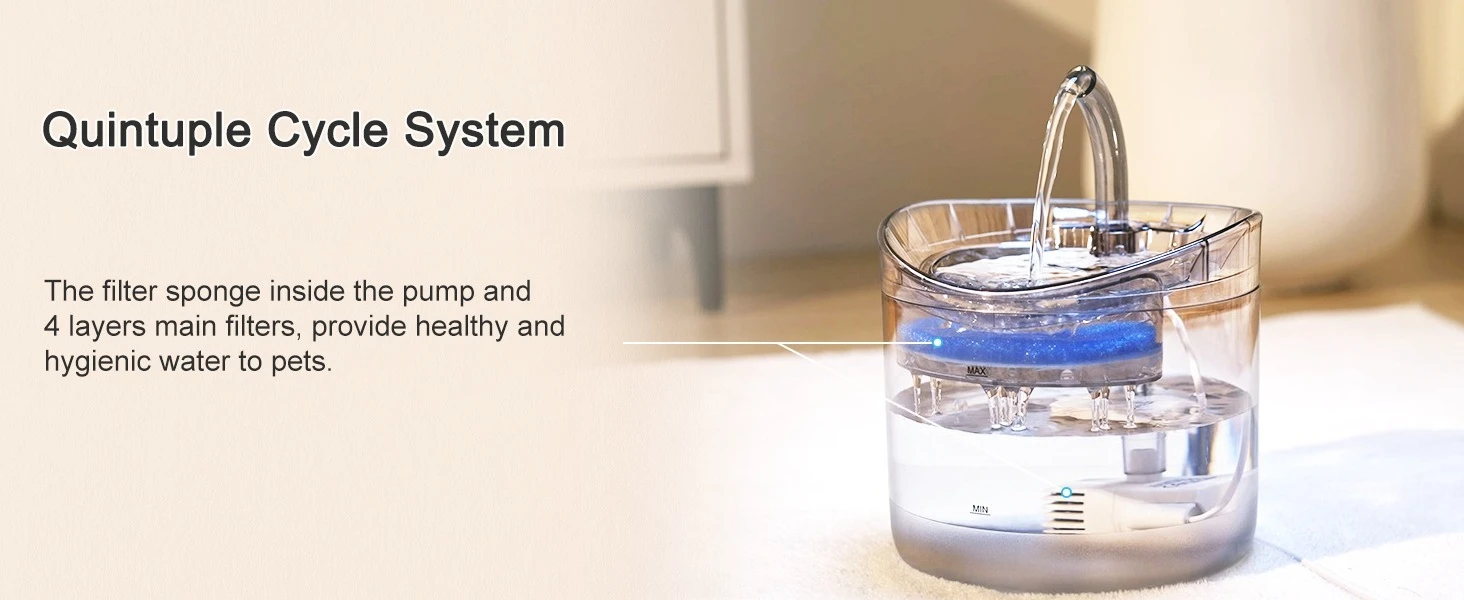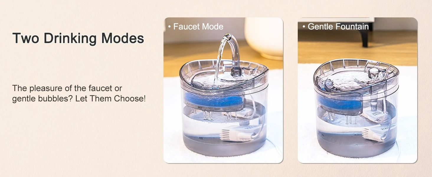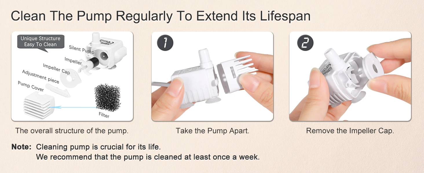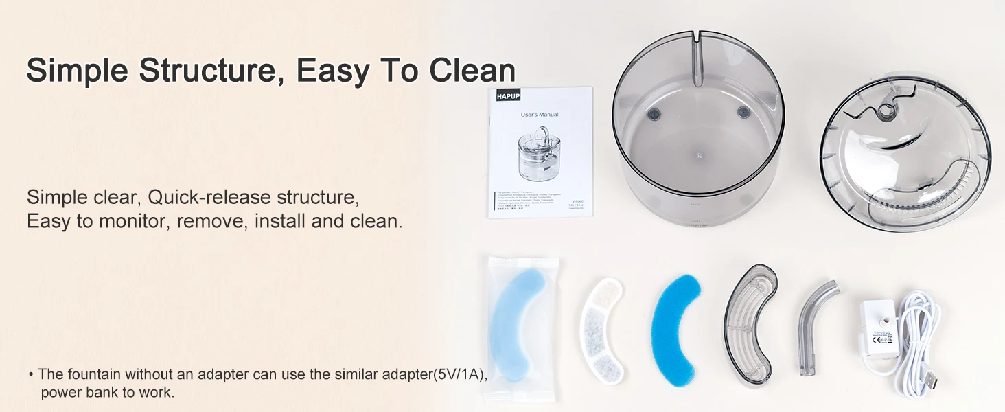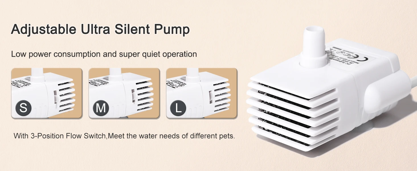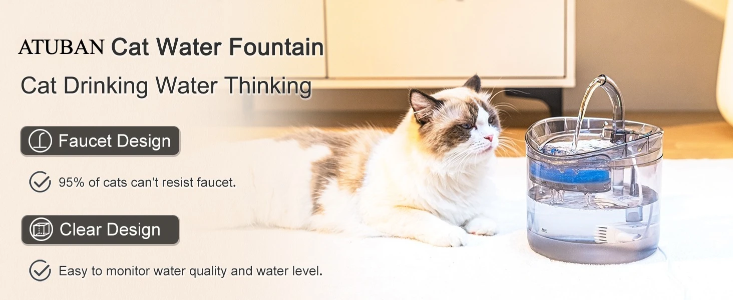 [Dual Working Mode] With the arc-shaped faucet and inclined slope water flow design, the ATUBAN cat fountain water bowl have 2 different flow modes. Fountain mode increases water oxygen content and freshes spring water surge mode. Faucet Mode attracts pets to drink more water, prevent pets to drink tap water. Each dog water dispenser mode meets bird and cat feeding & watering supplies, and the unique pet drinking fountain curve design reduce pressure on pet's cervical spine.[Gold Capacity & Simple Appearance] The ATUBAN dog fountain water tank without no extra bumps can hold 1.8 L / 61 OZ water and be cleaned easily by the cleaning brushes kits. The water fountain for cats is suitable for vary pets households. No need to replenish water frequently, the storing water can last for a week. Therefore, you can go out for days without any worry. 120 ML / 4 OZ cat fountain water storage bowl provides one-day drinking water for cats in case of a power outage.[Quintuple Cycle System] With 2 bonus blue replacement filters, the cat water fountain storage bowl adopts a Low lying hollow drain hole of Upper-Water Bowl to form 5 cycle system, which guide the coarser particle to the 4 layers filter to filter. The Blue pre-filter sponge filter big impurities. White PP cotton could catch cats hair and tiny debris in the pet water dispenser, the ion exchange resin layer could soften the tap water, the activated carbon layer could remove bad taste and odor.[Adjustable Ultra Silent Pump] With 3-Position Selective Flow Switch and 3 Silicon Strong Suction Cups, the Ultra Low Noise Low Consumption DC5V USB Connected Pump can stand on the bottom of the pet water fountain stably and customize the cat water stream. The Power Cable Length of pump is 78 In / 1.98M (except the pump head). Without an Extra Adapter, the cat fountain pump features simple quick-release structure, easy to remove, install and clean. Leave a sweet dream to you and your pets.[Risk Free Service] ATUBAN Pet Drinking Fountain offers a 12-month maintenance service. If your pump stops working during the maintenance period, please contact us for a replacement. Additional accessories are also available for getting in our store. Search "HAPUP filter" and "ATUBAN water pump" to find replacement parts. If you encounter any products issues, please contact ATUBAN customer support via Aliexpress.How to use the ATUBAN cat fountain properly?Please refer to the product manual to clean and maintain regularly. For your pet’s health and a longer pump service life, we recommend cleaning the Water Tank, Tray, Foam Filter and Pump at least once a week.What should I do if my cat is not interested in a cat drinking fountain?Keep the cat fountain running continuously by plugging in, place it where it can be easily accessed, smelled and seen. Leave it on for a day or two and change the water daily. Kitty will probably observe and even start drinking from the fountain.What should I pay attention to before the first using of the water fountain?The fountain without an adapter can use the similar adapter(5V/1A) to work.Soak the filter for 10 minutes and rinse the filter for 30 seconds to ensure filtration effect.Make sure the filter is SOAKED thoroughly, otherwise it will just spill over.How can I purchase more filters for the ATUBAN cat fountain?For your pet's health and safety, please search ATUBAN to purchase ATUBAN the official Filters on aliexpress. DO NOT use the cheap and pirated filters.According to the drinking frequency and pets number, replace the filter every 1 to 4 weeks.What should I do if the water flows too small or no water?Check the following three aspects:1. Is the water pump installed at the designated location?2. Is the water level within the maximum and minimum range?3. Whether the water pump and impeller are clogged and cleaned regularly?
